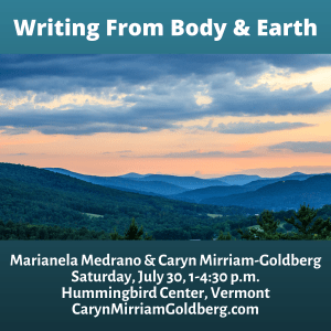 July 30: Writing from Body & Earth with Marianela Medrano & Caryn Mirriam-Goldberg: Join us for an afternoon of “Writing From the Body” with Marianela Medrano and “Writing From the Earth” with Caryn Mirriam-Goldberg. By writing about where we are – as bodies, and as part of the earth — we can generate powerful, new writing as we deepen our sense of being at home in our skin and on the earth. We’ll explore identity, callings, embodiment, personal history, ecology, and what it means to both live in specific bodies and places. Most of all, we’ll be illuminating how to make the visible – what’s right here in/of our bodies, dwellings, local terrain, weather and skies – more visible, and use that new vision as a lantern to lead us toward greater homecoming. Registration information and details here.